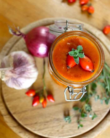 Auf dem Foto sieht man ein Glas Hagebutten Ketchup auf einem Holzbrett stehen. Auf dem Brett sieht man auch Zwiebeln, Hagebutten und Kräuter. | © SONNENTOR