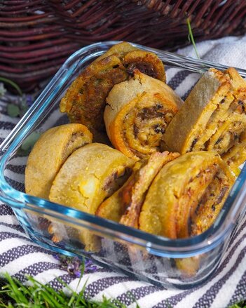 1. Mit der zweiten Hälfte des Teiges genauso verfahren, nur dieses Mal die Champignon-Kräuterfüllung darauf verteilen.